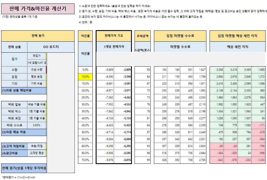 (예시) 판매 가격 & 마진율 계산기 (항목별 기본 정보만 넣어도 바로 알 수 있어요!)