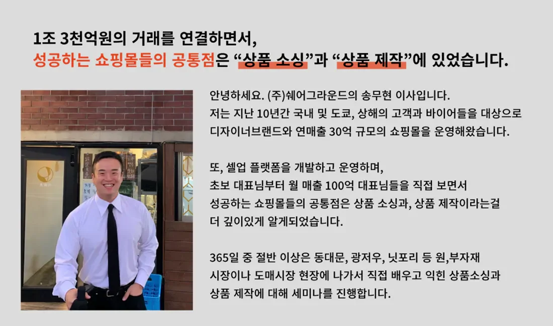 사입 현장 투어는 "돈 버는 쇼핑몰의 기초"를 강의하는 저, 송무현 강사와 함께합니다.